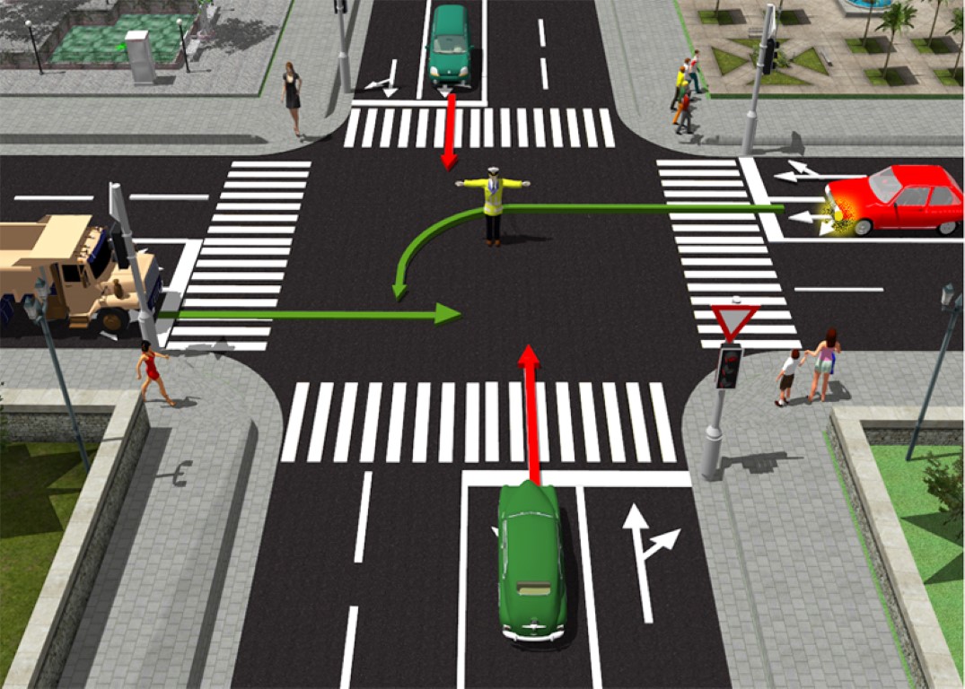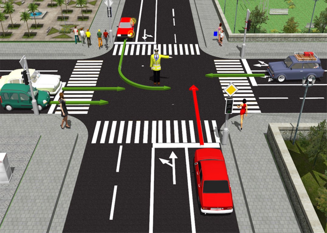 În figura alăturată obligativitatea opririi se impune autovehiculului care vine din faţa poliţistului (al cărui sens de deplasare este figurat cu săgeată de culoare roşie) deoarece circulă din direcţia ce intersectează braţul poliţistului. |