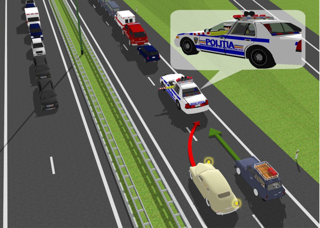Poliţistul rutier, aflat într-un autovehicul al poliţiei, poate executa semnale cu braţul, cu sau fără baston reflectorizant, scos pe partea laterală dreaptă a vehiculului.